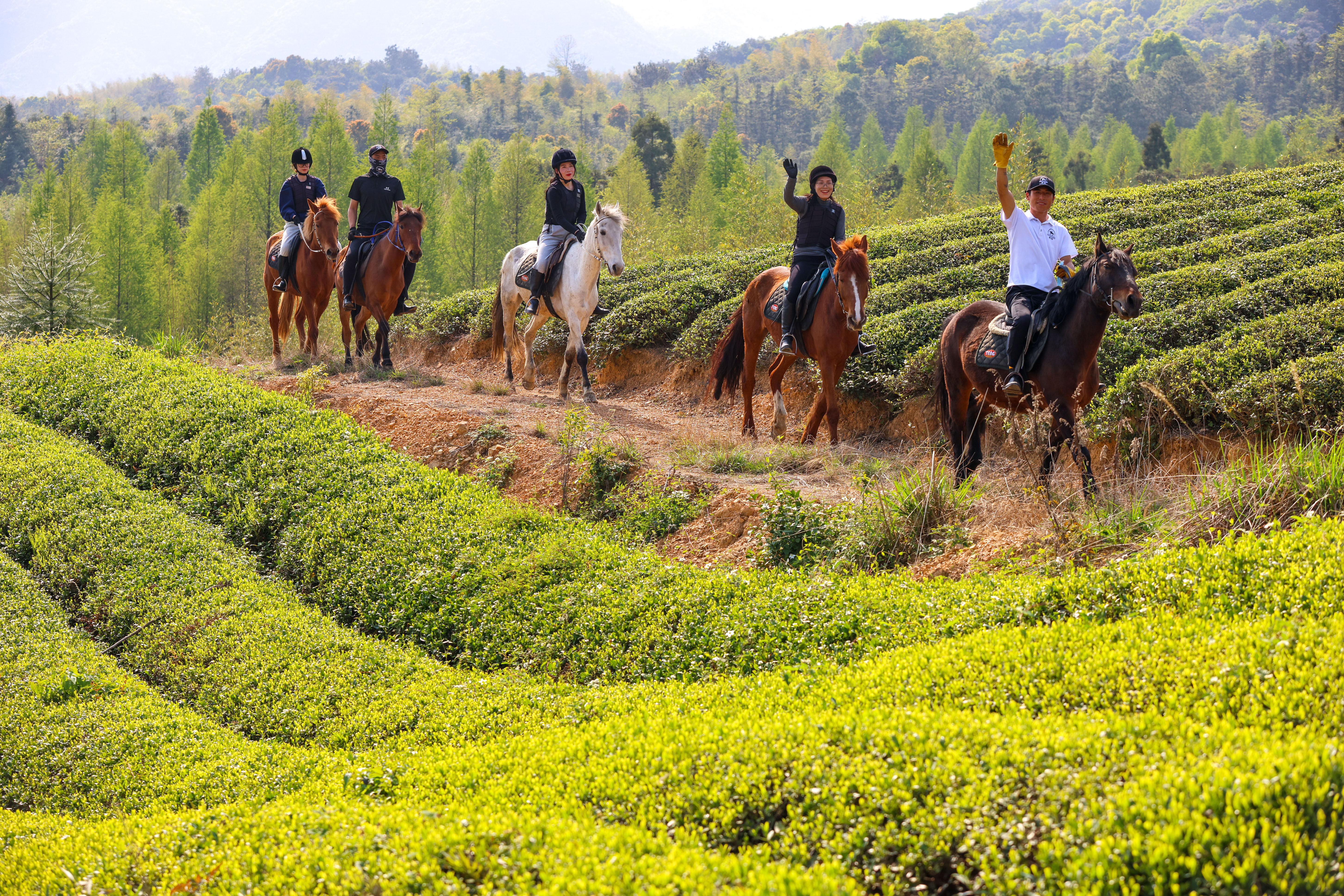 ↑2022年4月7日,在浙江省湖州市德清县莫干山镇一家骑马场,游客们在体验茶园骑马。CICPHOTO/白羽 摄