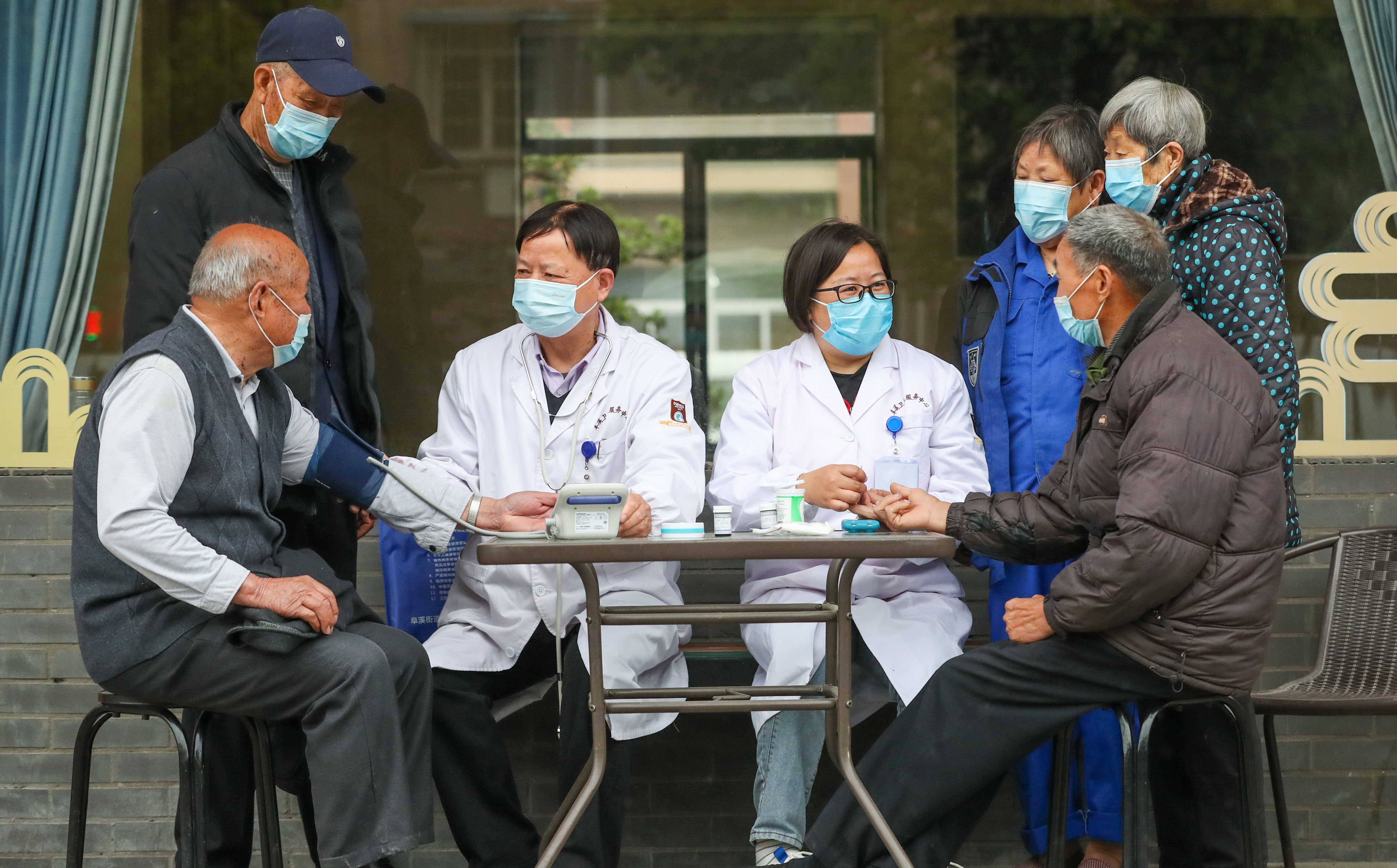 ↑2022年4月13日,在浙江省湖州市德清县阜溪街道狮山社区幸福邻里中心,家庭医生为居民测量血压、血糖,提供健康指导。CICPHOTO/王树成 摄
