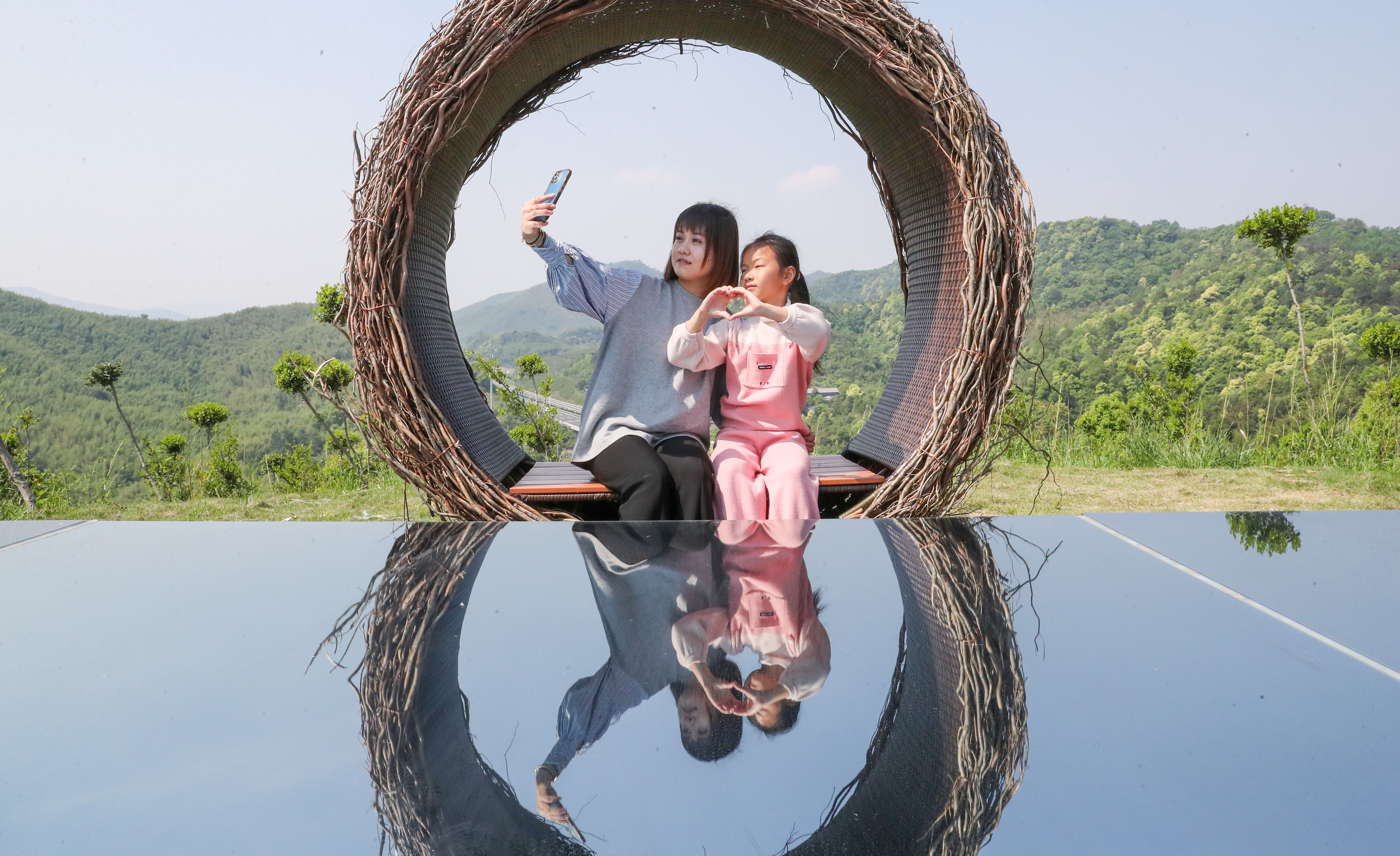 ↑2022年4月17日,在浙江省湖州市德清县莫干山镇五四村莫干花谷旅游景区,游客在景区内网红鸟巢拍照留念。CICPHOTO/王树成 摄