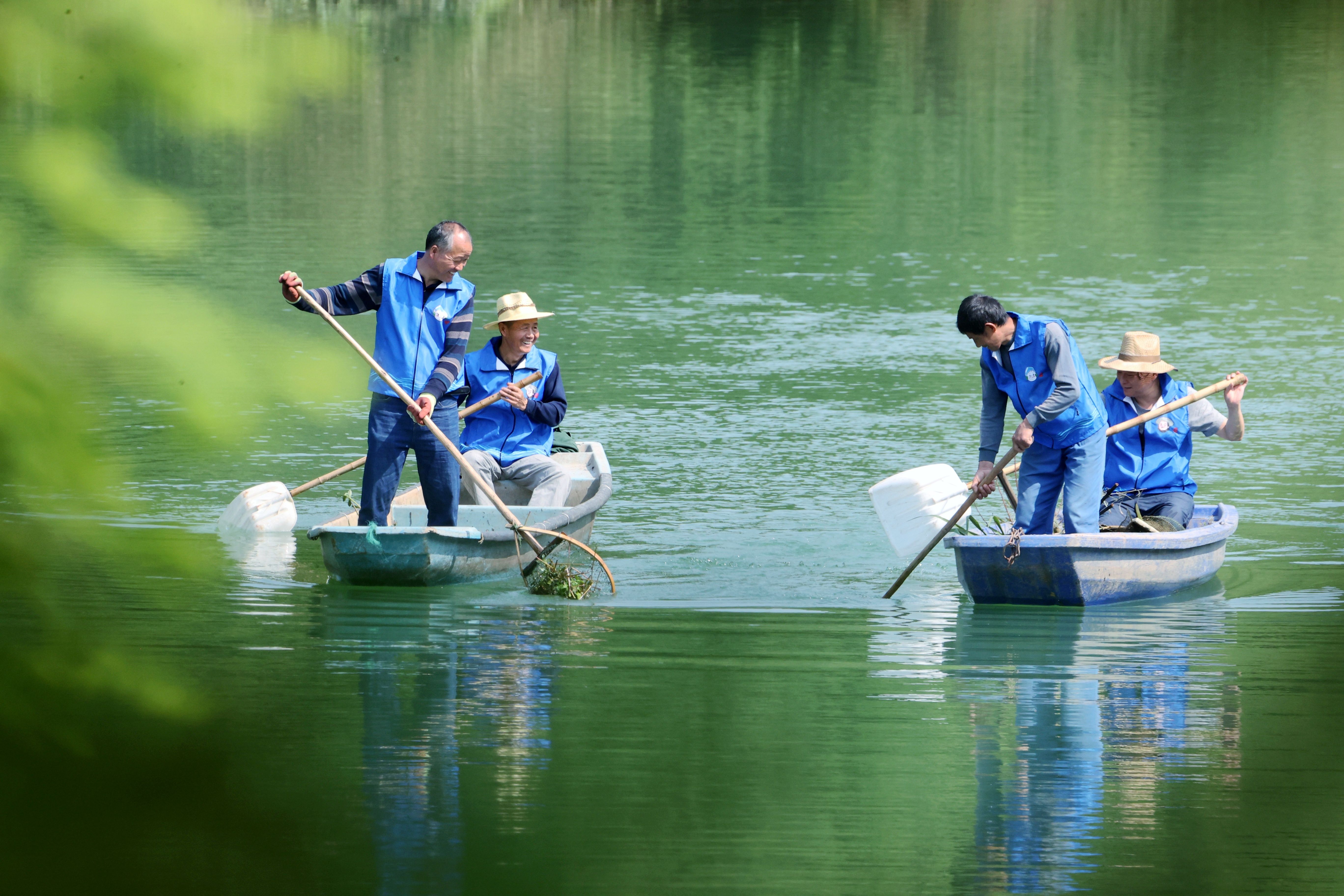 ↑2022年5月16日,在浙江省湖州市德清县阜溪街道龙胜村,村级河长在泉年坞山塘开展巡库护水。CICPHOTO/谢尚国 摄