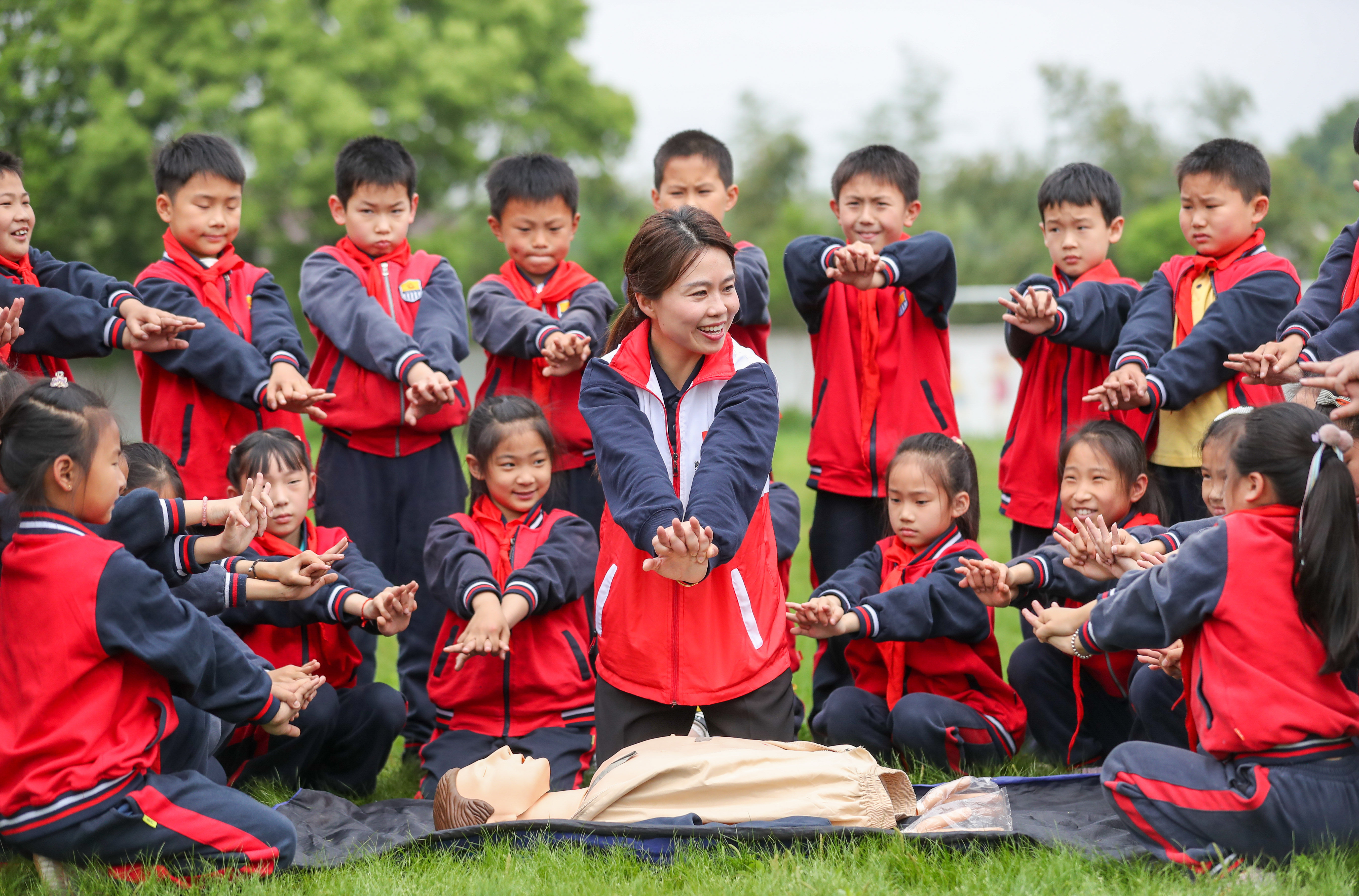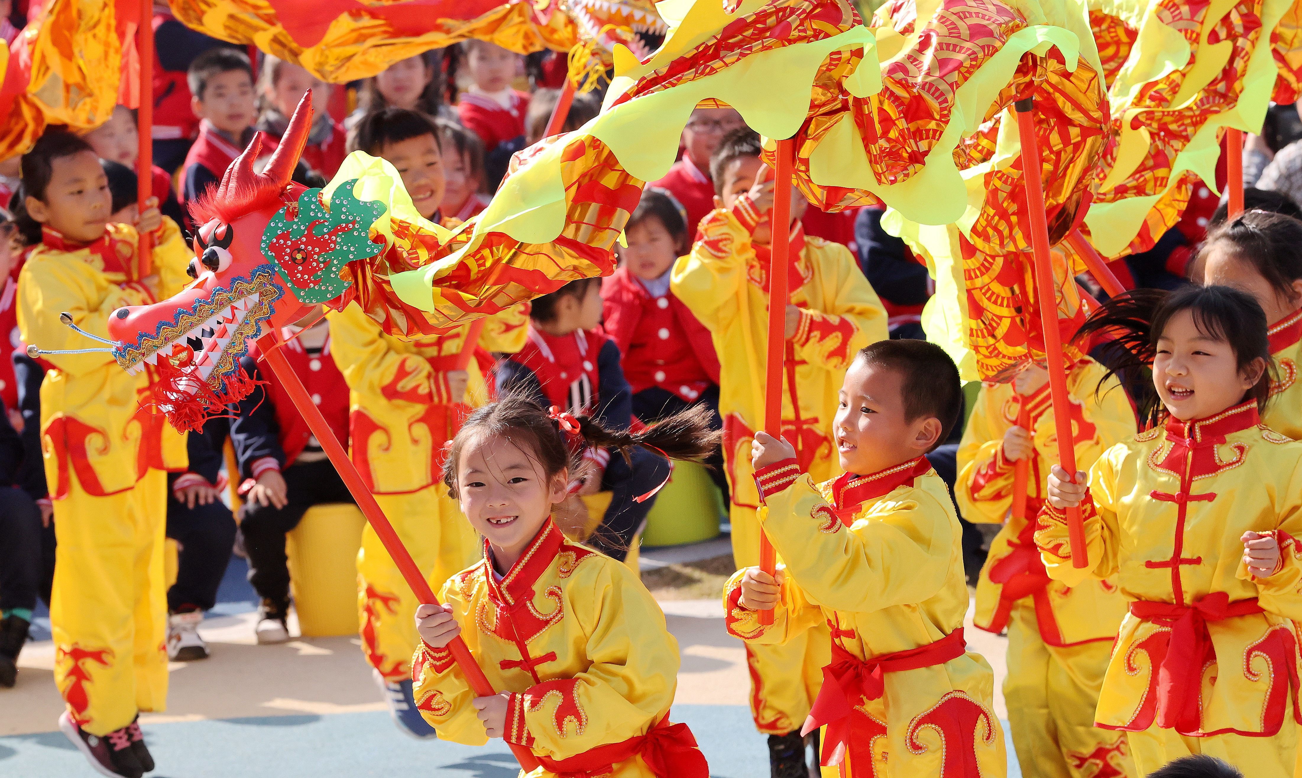 ↑2021年12月6日,在浙江省湖州市德清县康乾街道浙江工业大学附属秋山幼儿园,孩子们在进行舞龙表演。CICPHOTO/谢尚国 摄