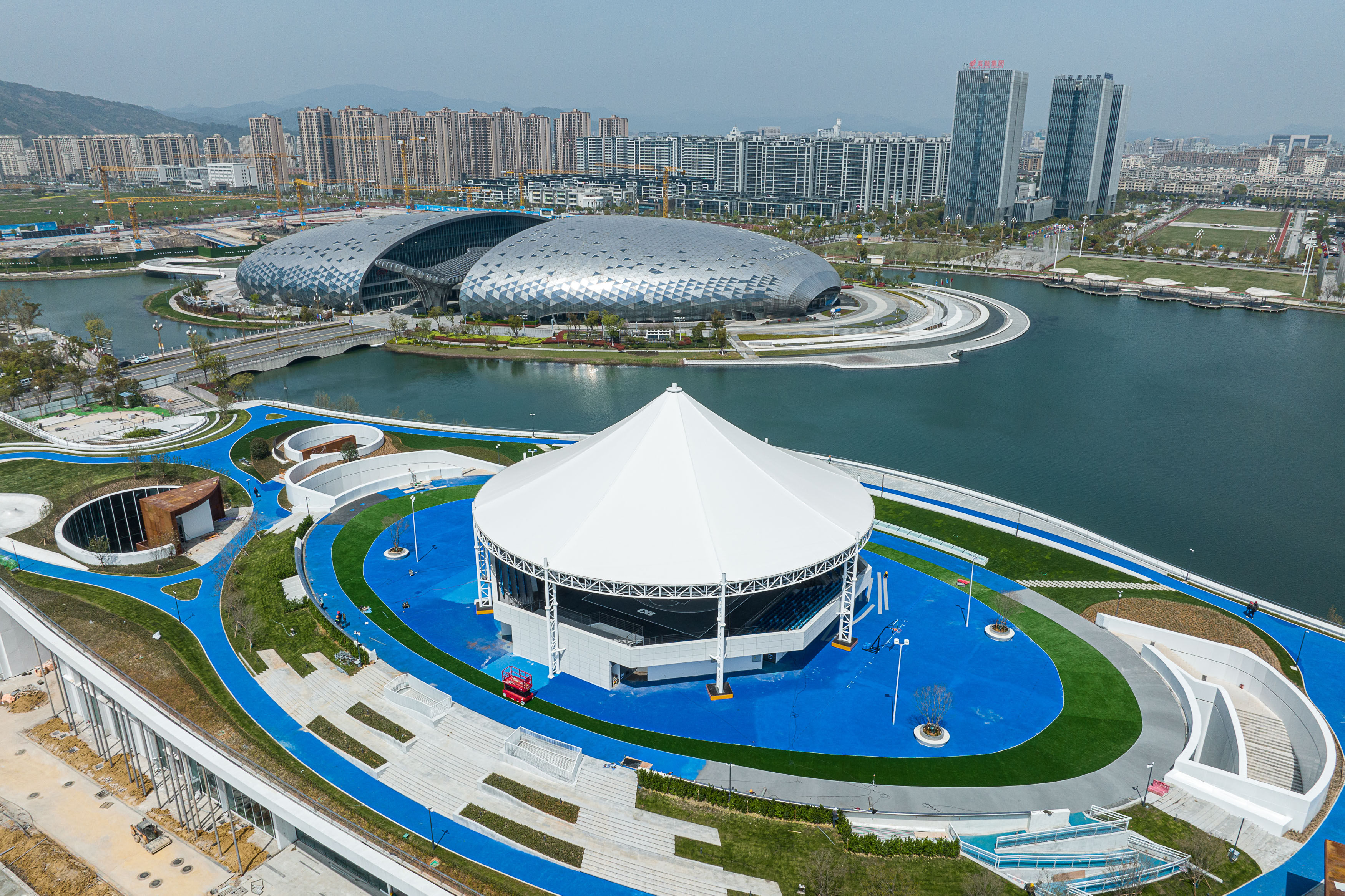 ↑2022年3月29日,在浙江省湖州市德清县,从空中俯瞰即将竣工的2022年杭州亚运会三人制篮球场馆。(无人机照片)CICPHOTO/伊凡 摄