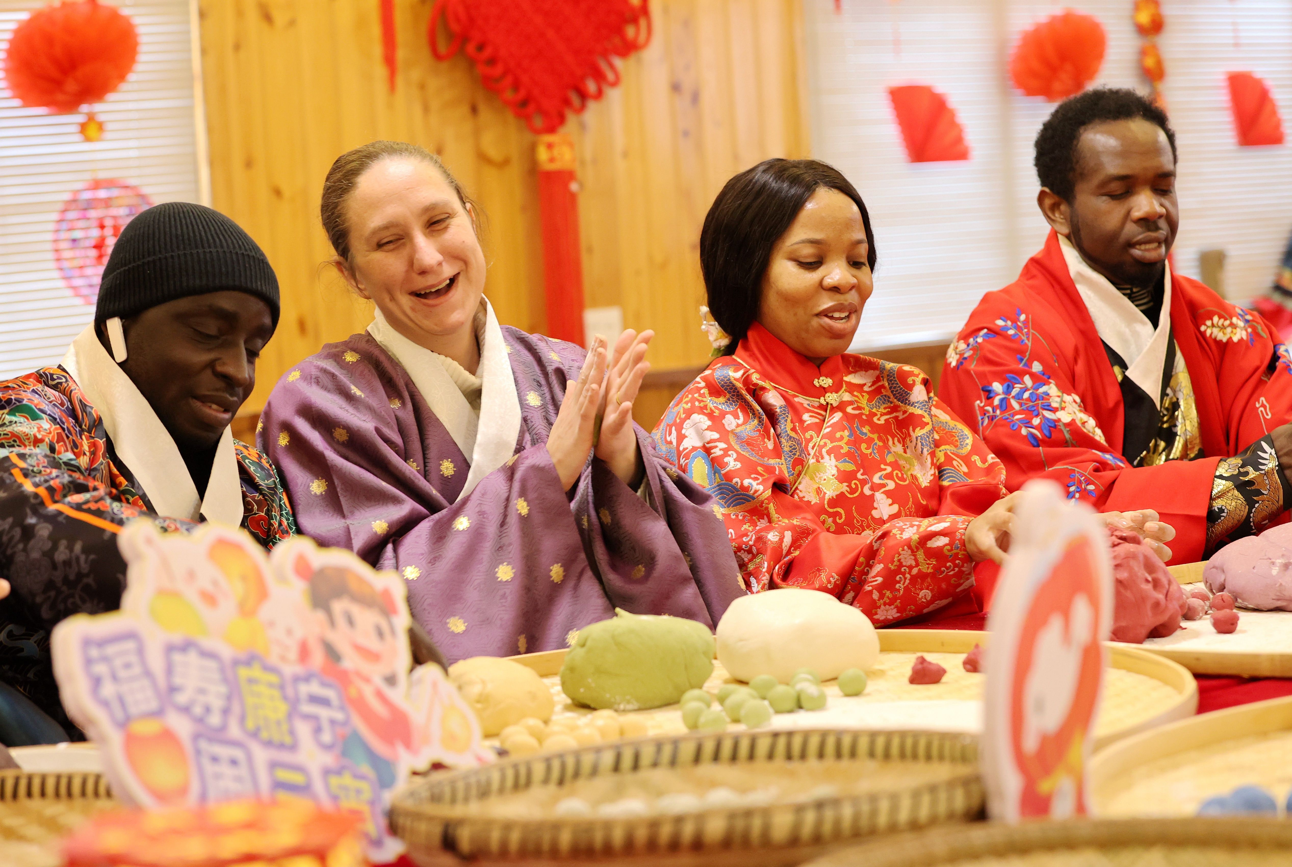 ↑2022年2月13日,在浙江省湖州市德清县康乾街道新琪村,外国友人在体验做汤圆。CICPHOTO/谢尚国 摄