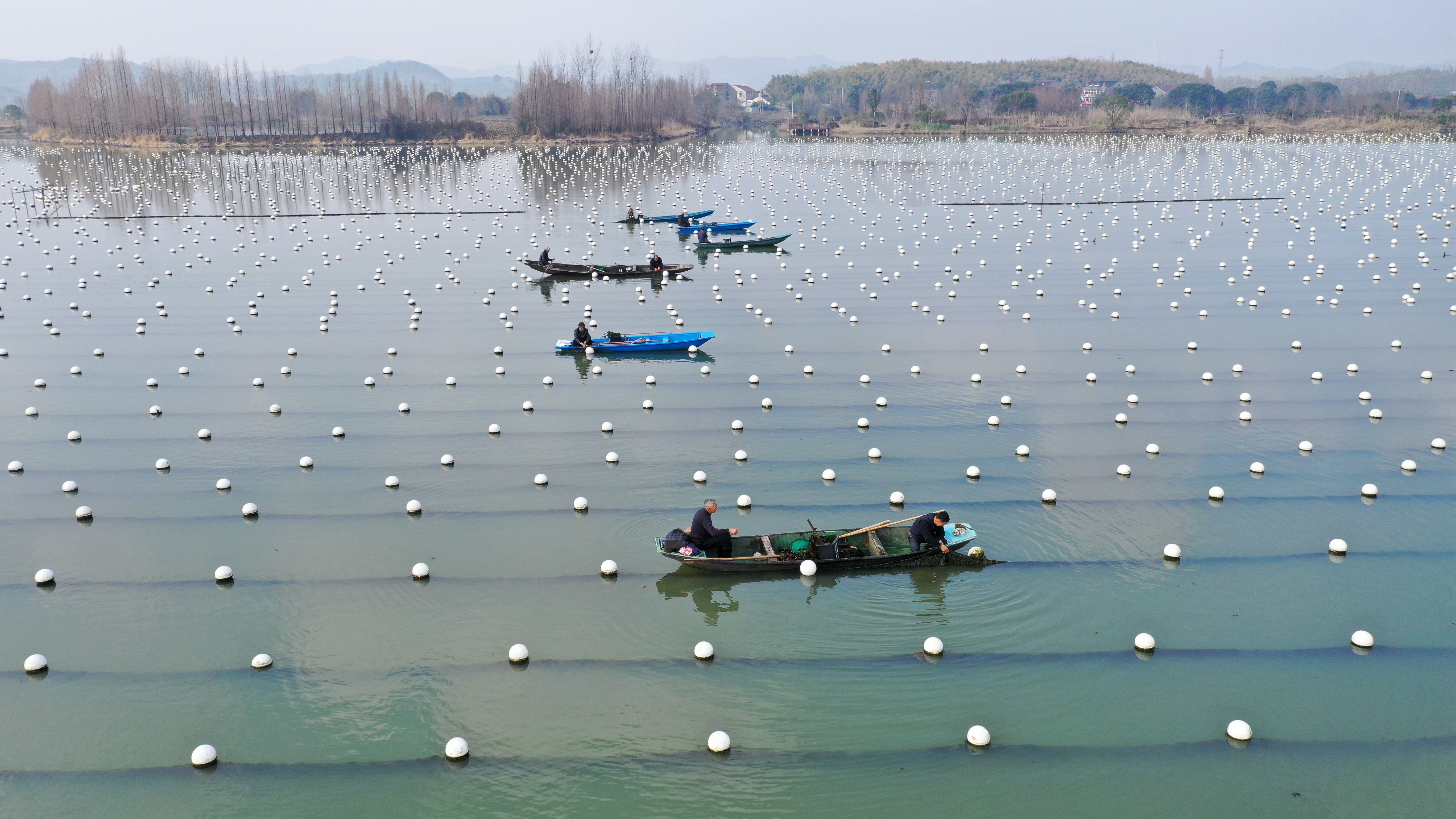 ↑2022年2月14日,在浙江省湖州市德清县洛舍镇的小山漾珍珠生态养殖基地,养殖户在珍珠蚌养殖塘里劳作。(无人机照片)CICPHOTO/谢尚国 摄