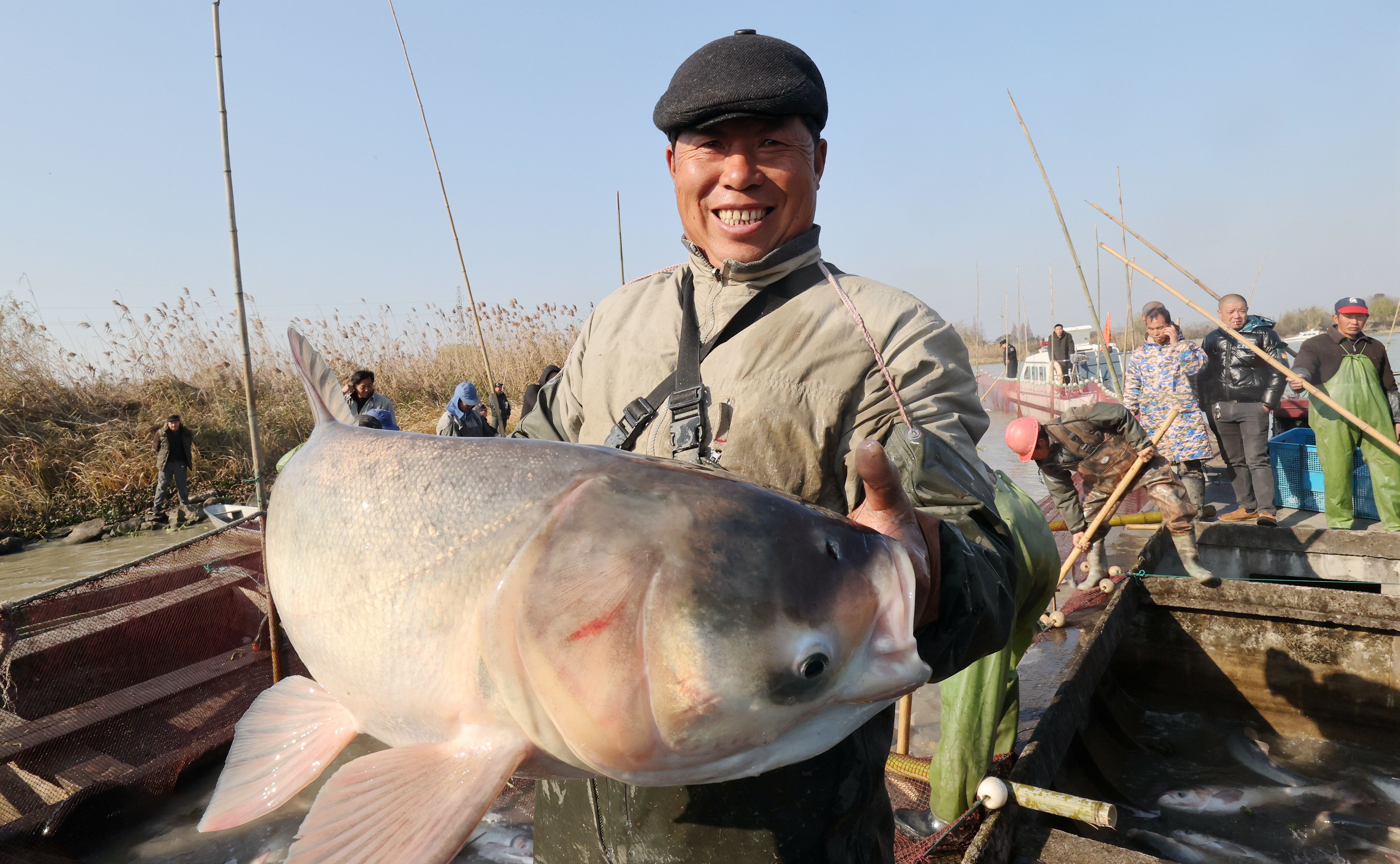 ↑2021年12月18日,在浙江省湖州市德清县新市镇宋市村,村民抱着捕获的大鱼开心不已。CICPHOTO/谢尚国 摄