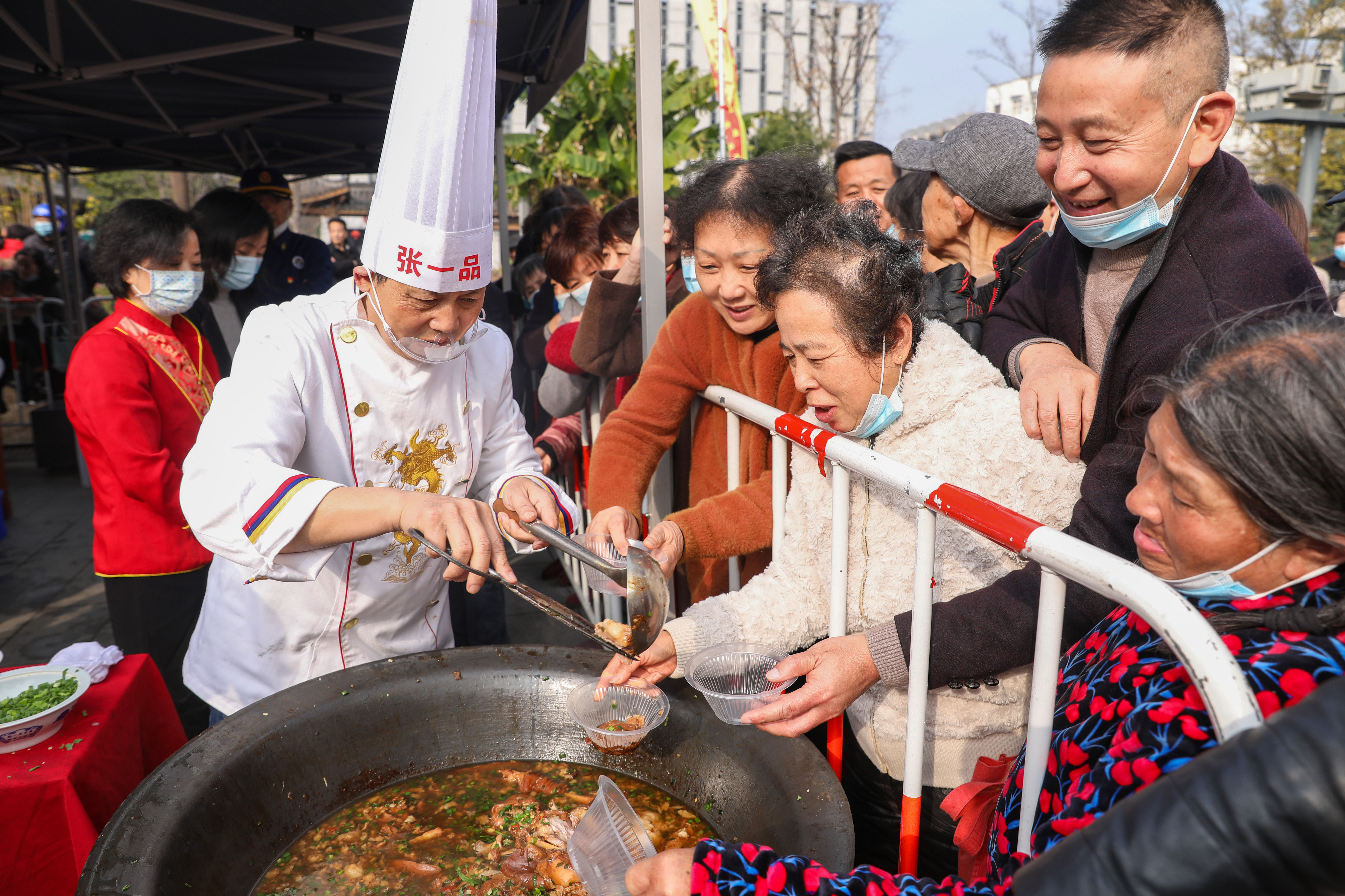 ↑2021年12月8日,在浙江省湖州市德清县新市镇羊肉黄酒节,市民游客在品尝羊肉。CICPHOTO/赵宁 摄
