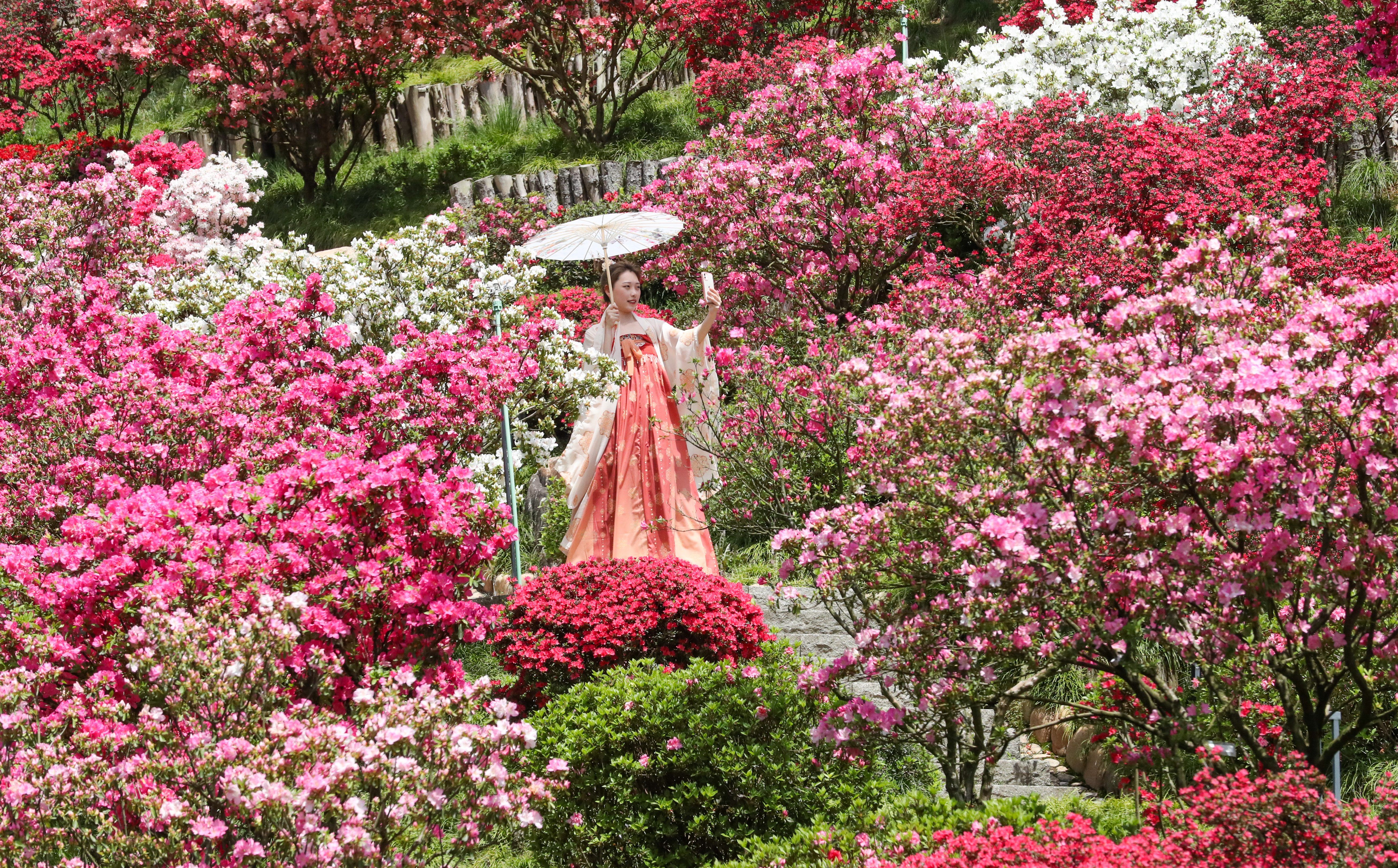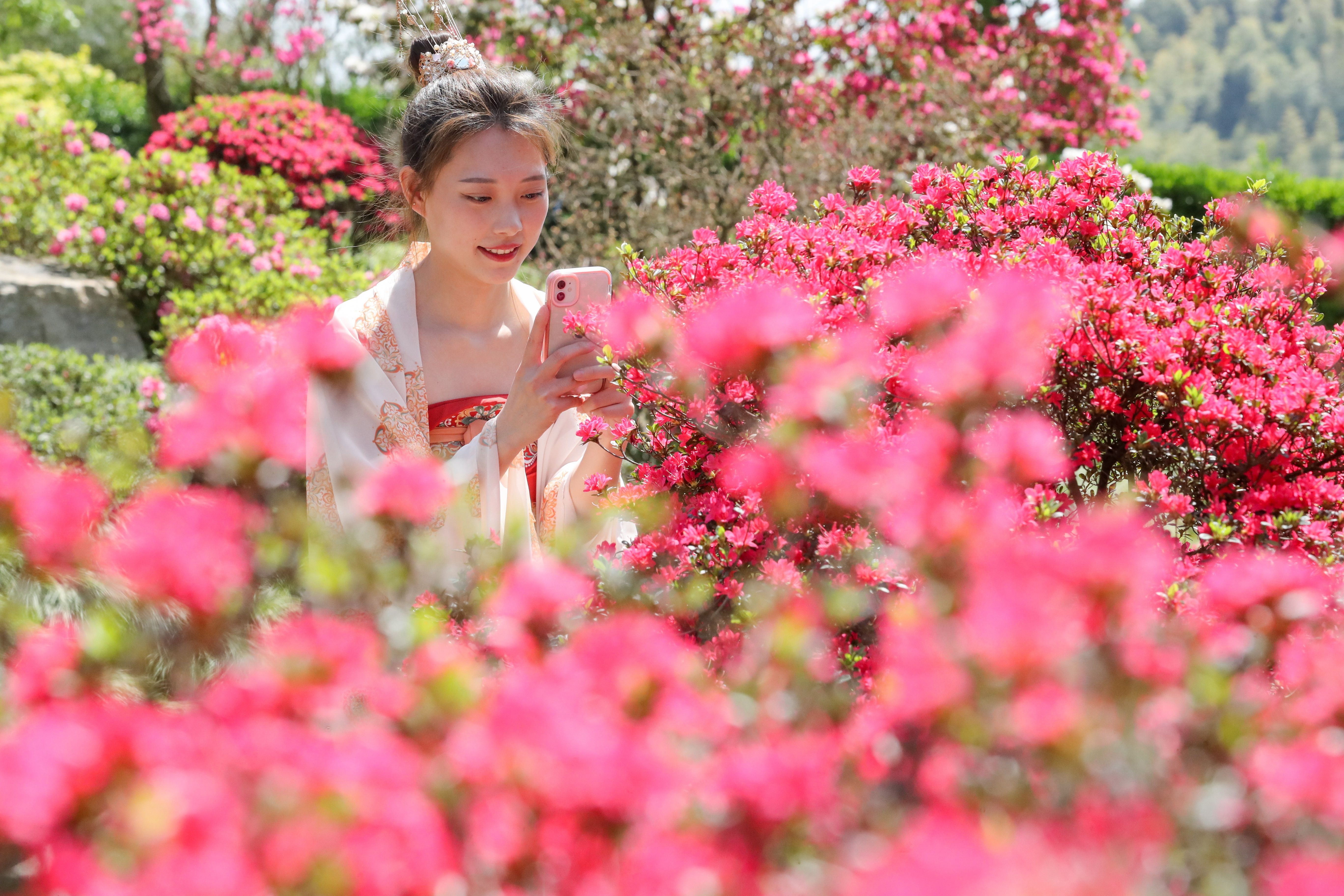 ↑2022年4月9日,在浙江省湖州市德清县下渚湖上渚山奇幻谷景区,游客在踏青赏花。CICPHOTO/谢尚国 摄