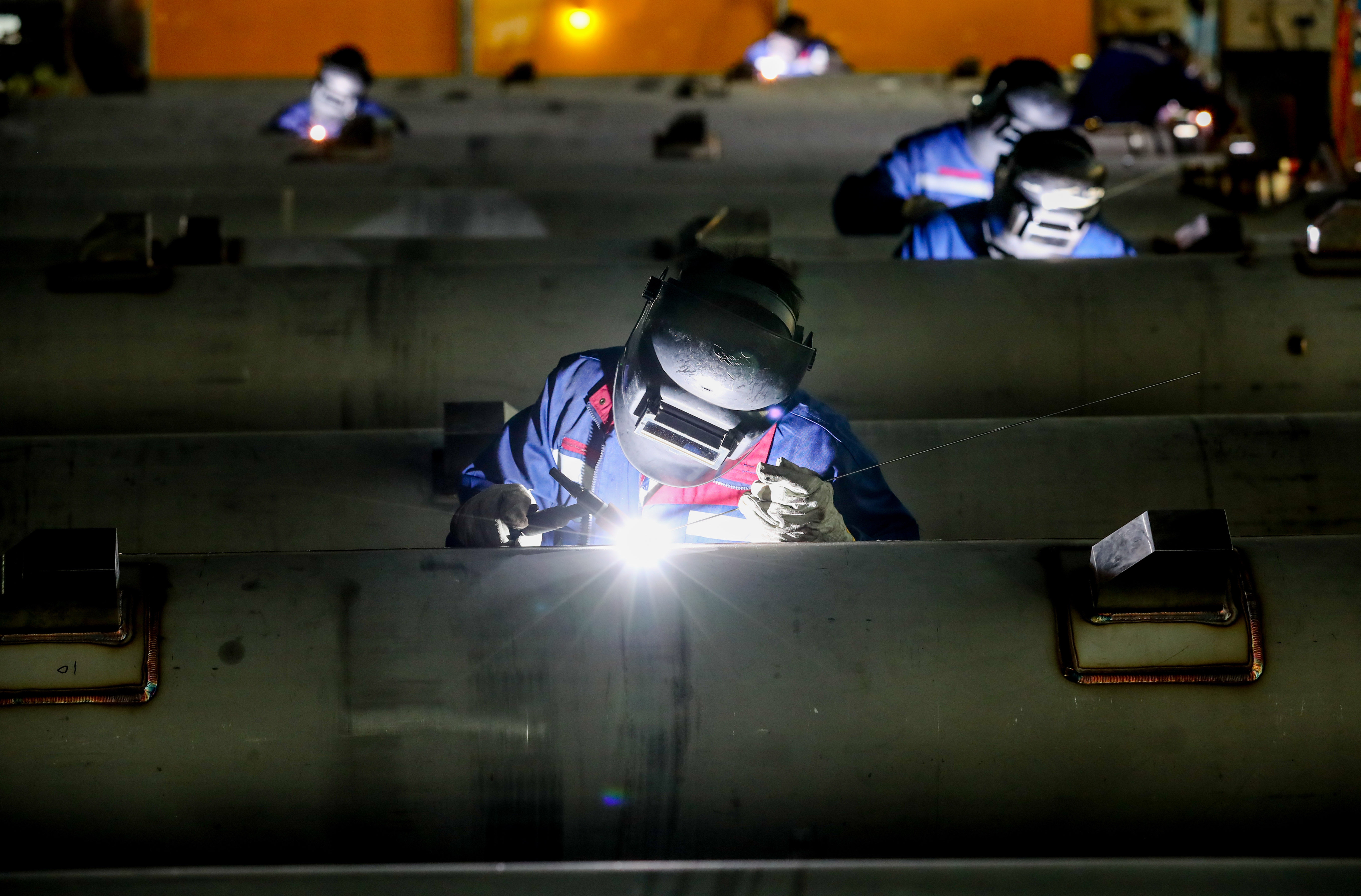 ↑2022年4月7日,在浙江省德清县钟管镇一智能装备股份有限公司生产车间,工人在焊接加工“智能染色机”零部件。CICPHOTO/王正 摄