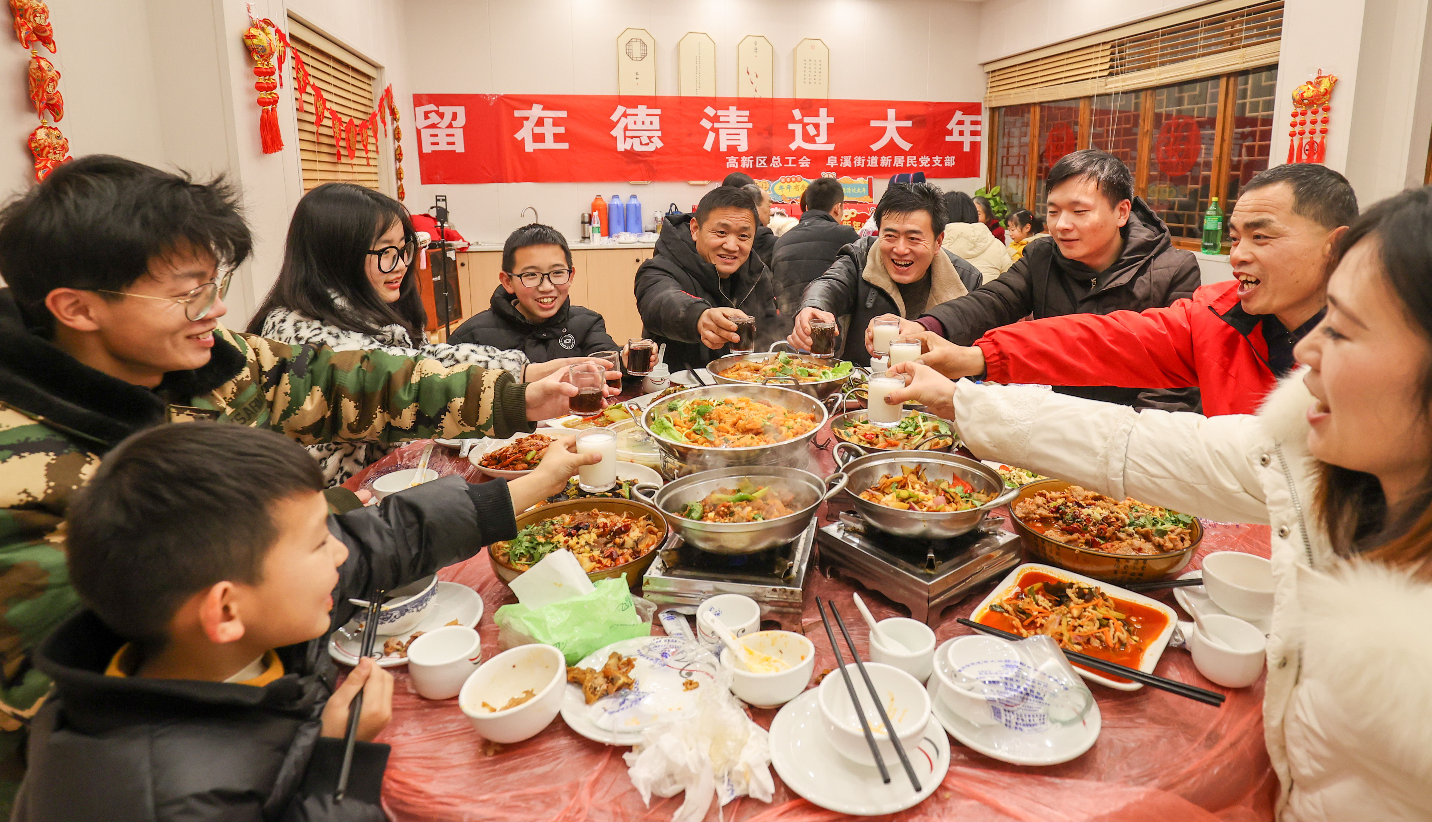↑2022年1月26日,在浙江省湖州市德清县阜溪街道兴山社区居家养老服务中心,新居民欢聚一堂,品尝“小年夜饭”。CICPHOTO/王树成 摄