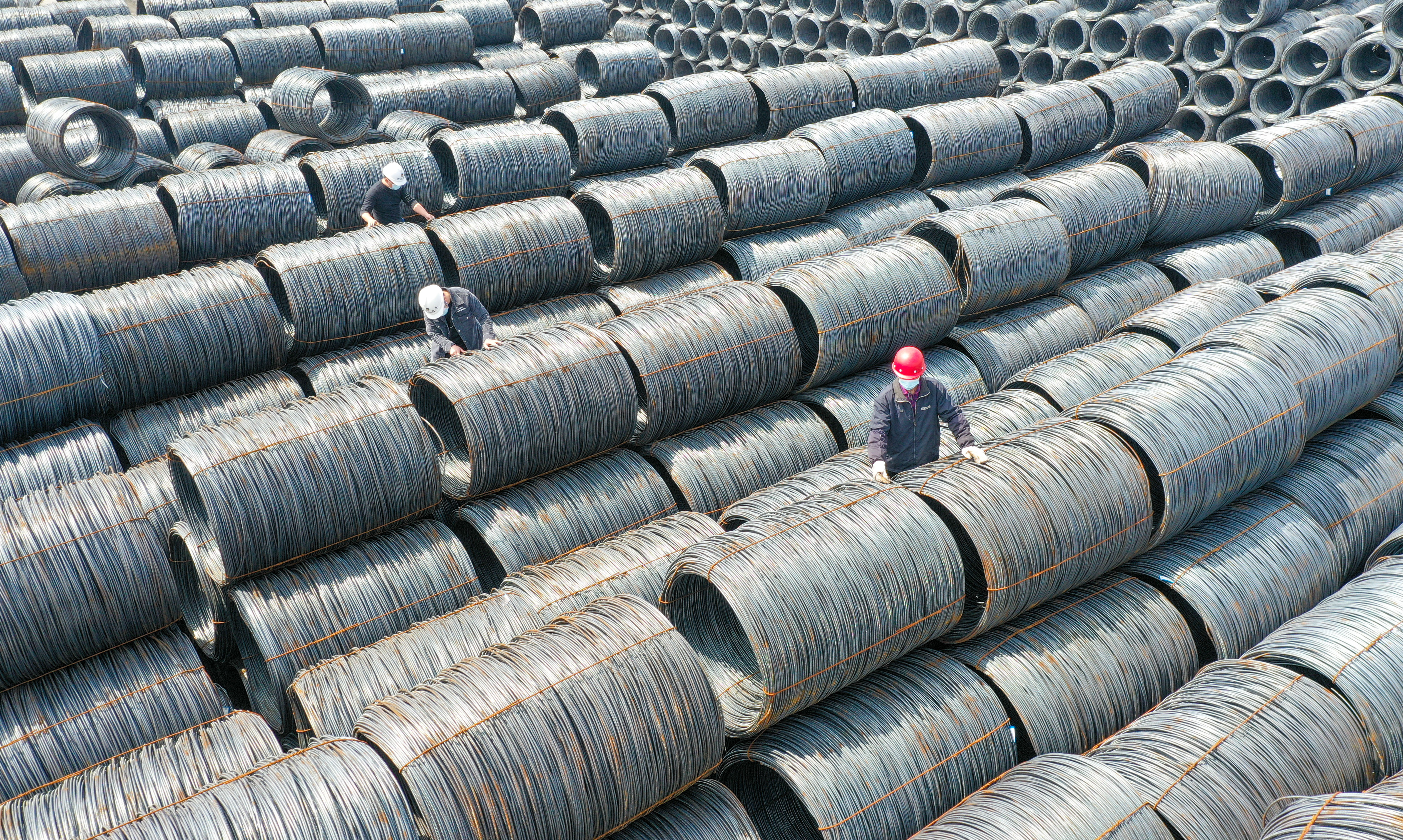 ↑2022年3月24日,在浙江省湖州市德清县新安镇的宝平物联网仓储基地,工人在钢材物流区作业。(无人机照片)CICPHOTO/王树成 摄