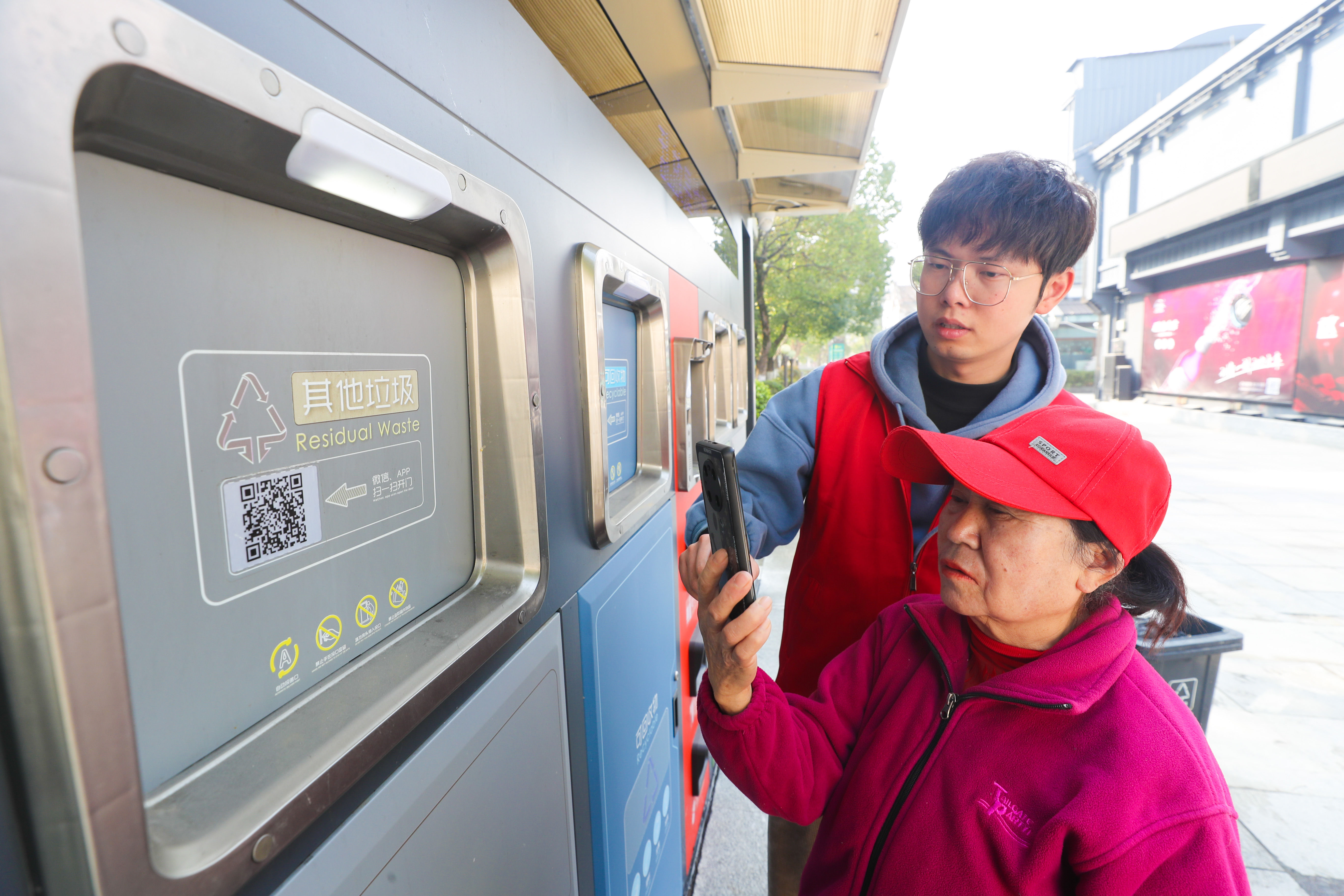 ↑2022年3月3日,在浙江省湖州市德清县武康街道余英坊商贸区,商户在青年志愿者指导下使用智能垃圾分类投放机。CICPHOTO/王正 摄