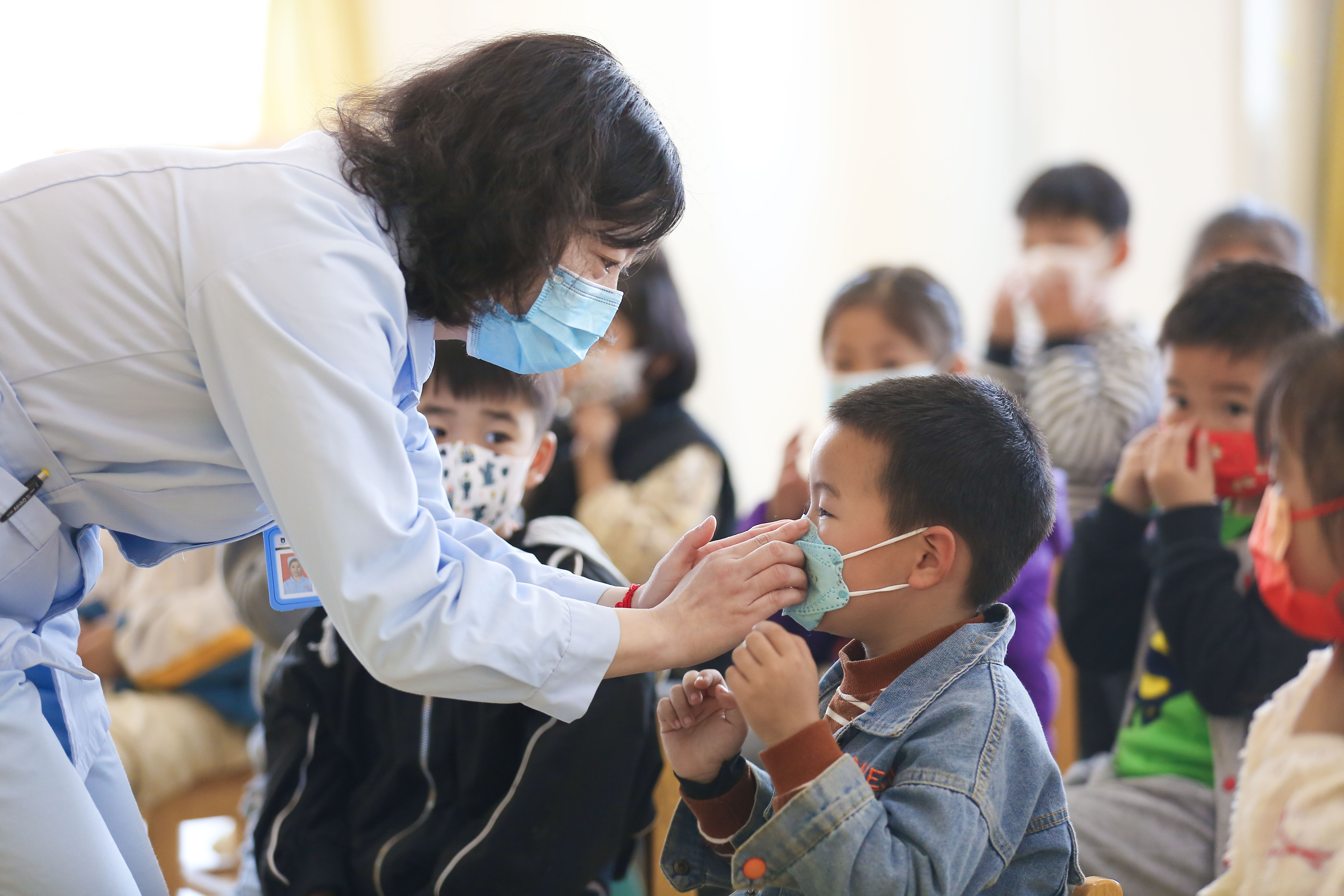 ↑2022年4月27日,在浙江省湖州市德清县阜溪街道三桥小学,红十字志愿者向学生们讲解心肺复苏急救知识。CICPHOTO/王树成 摄