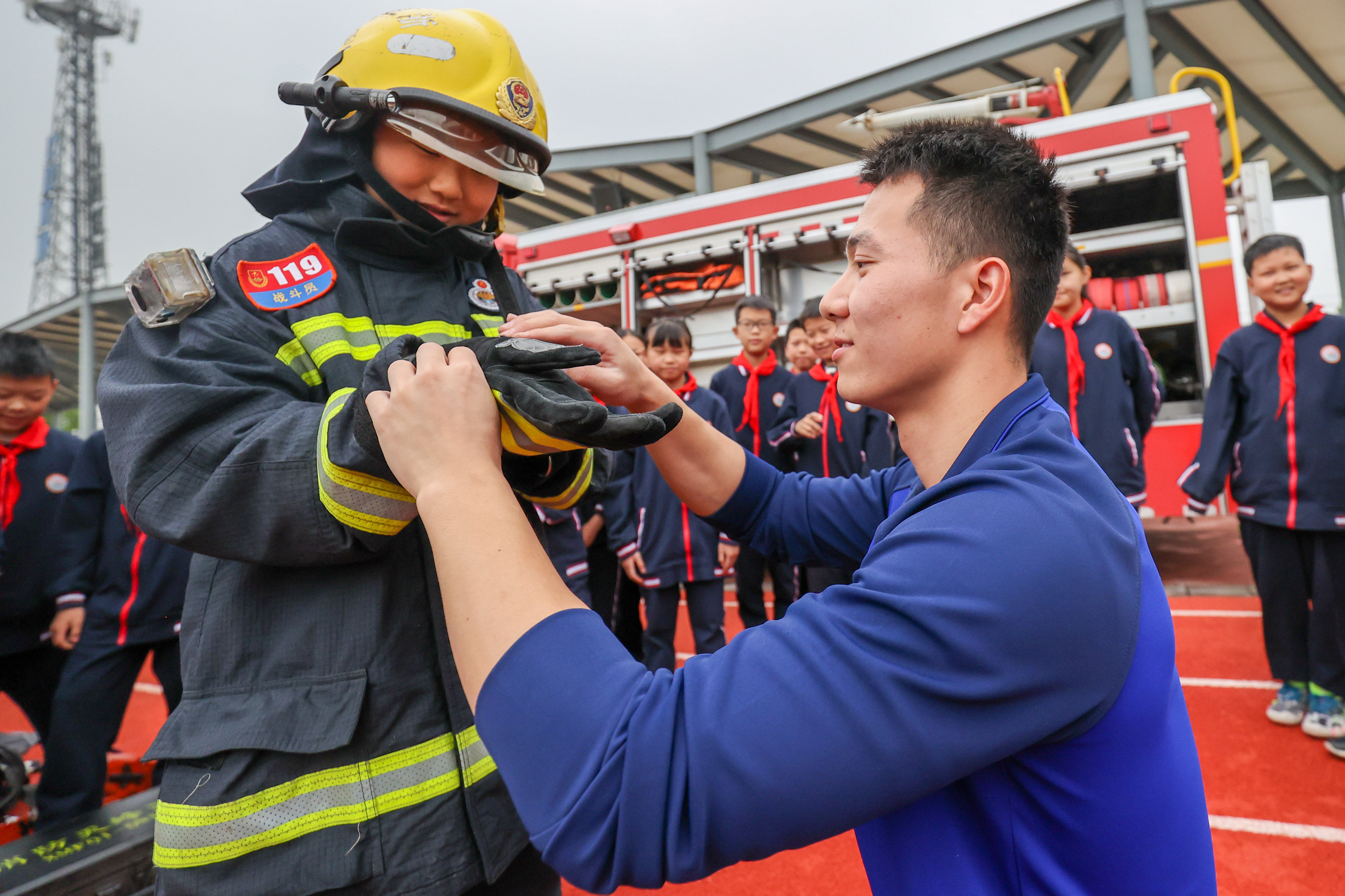 ↑2022年5月11日,在浙江省湖州市德清县下渚湖街道二都小学,学生试穿消防防护服。CICPHOTO/王树成 摄