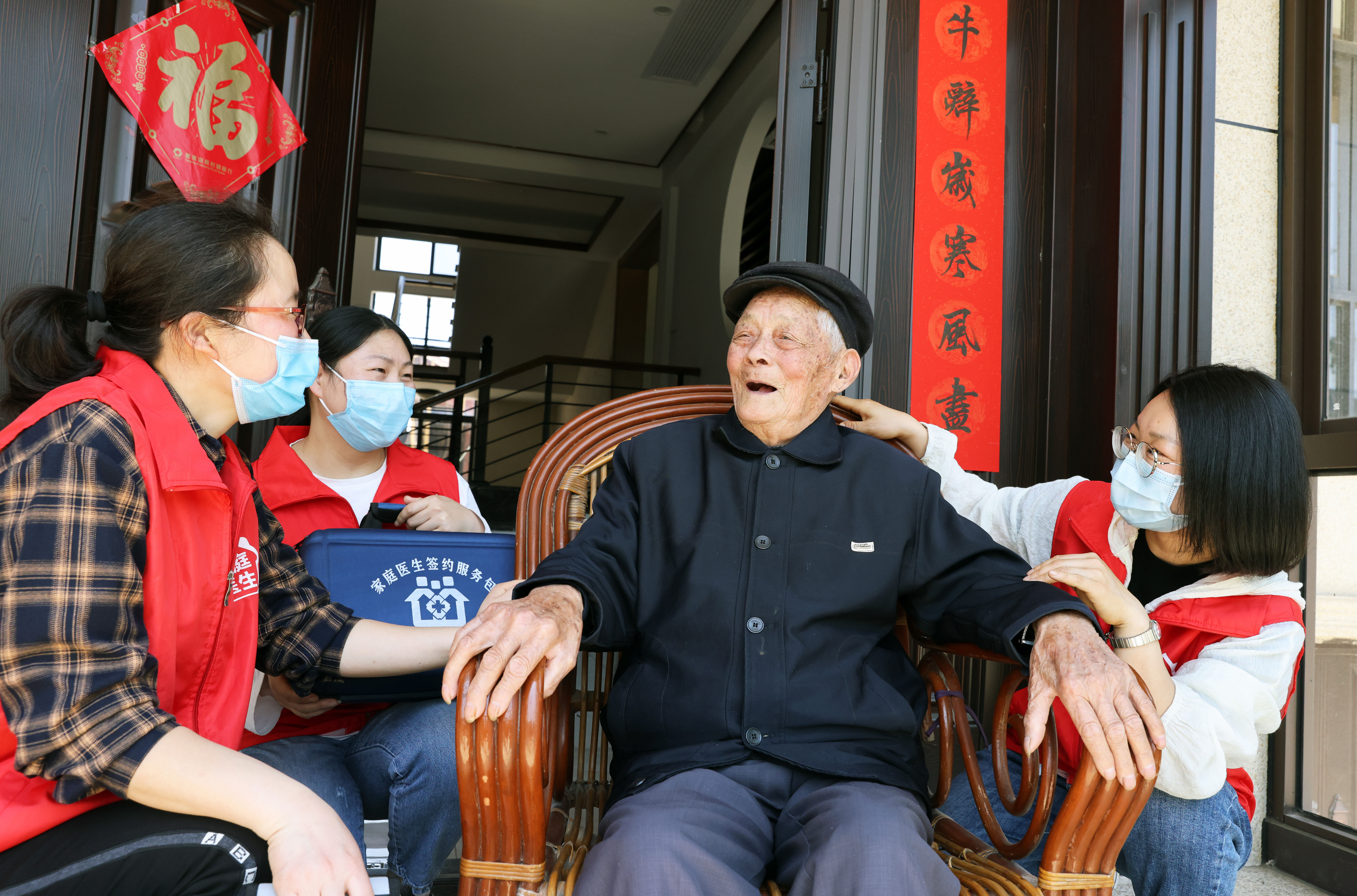 ↑2022年5月17日,在浙江省湖州市德清县乾元镇明星村,家庭医生为93岁的沈阿土(右二)提供健康指导和医疗服务。CICPHOTO/倪立芳 摄