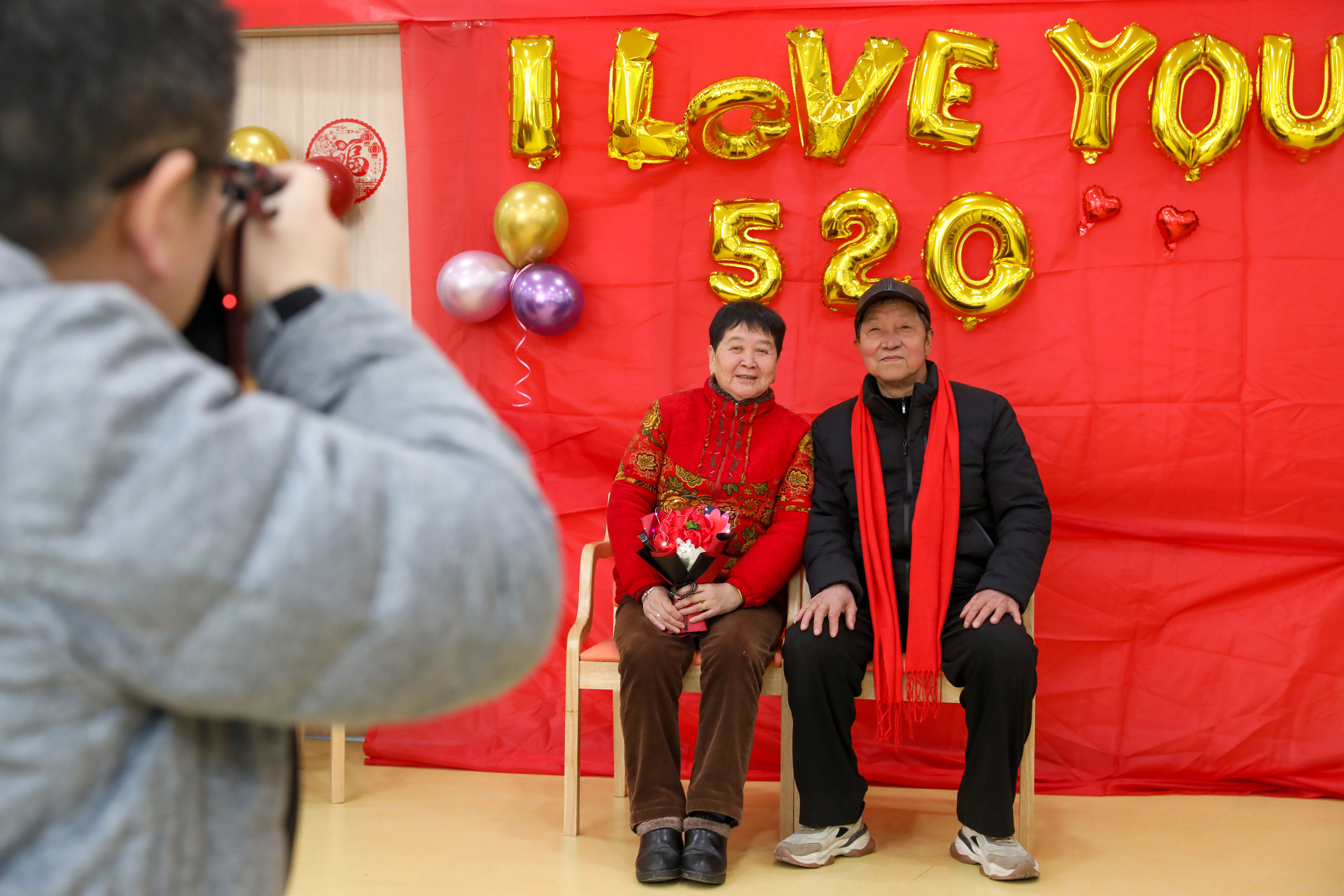 ↑2022年2月14日,在浙江省湖州市德清县武康街道示范型居家养老服务中心,摄影师为金婚夫妇拍照留念。CICPHOTO/赵宁 摄