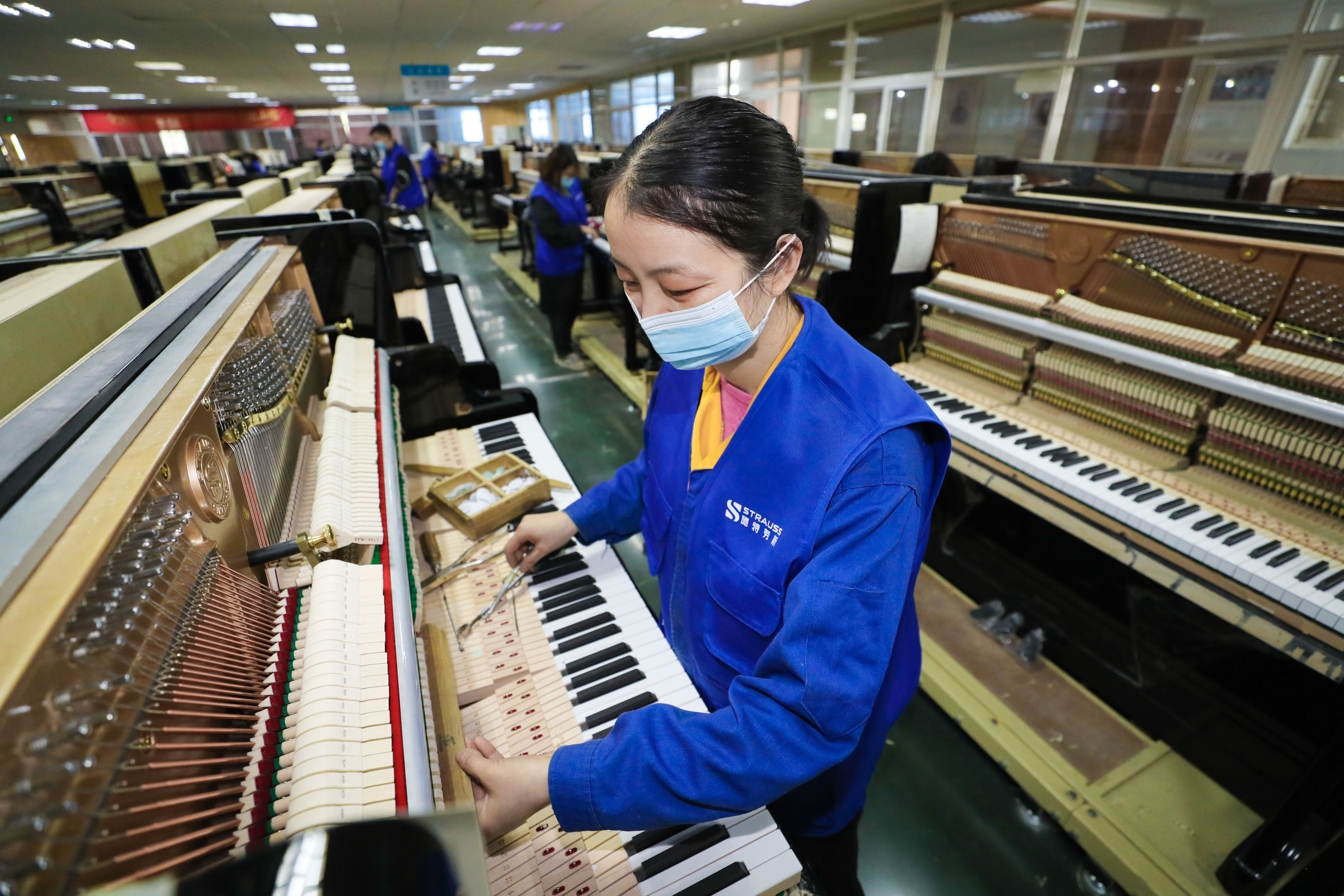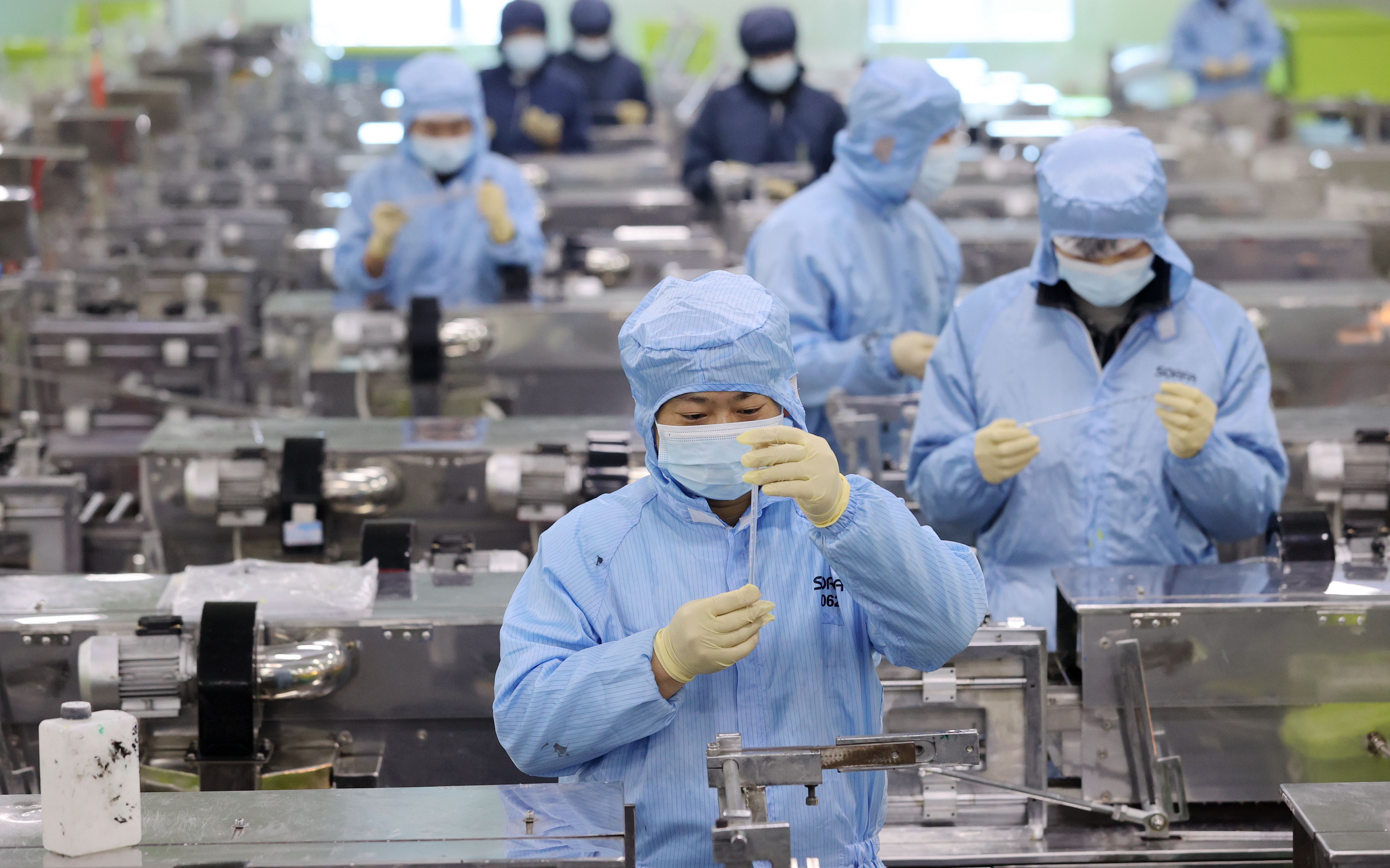 ↑2022年2月28日,在浙江省湖州市德清县钟管镇的一家医用器具生产企业车间,工人们在赶制一批出口欧洲的一次性医用采样器订单。CICPHOTO/谢尚国 摄
