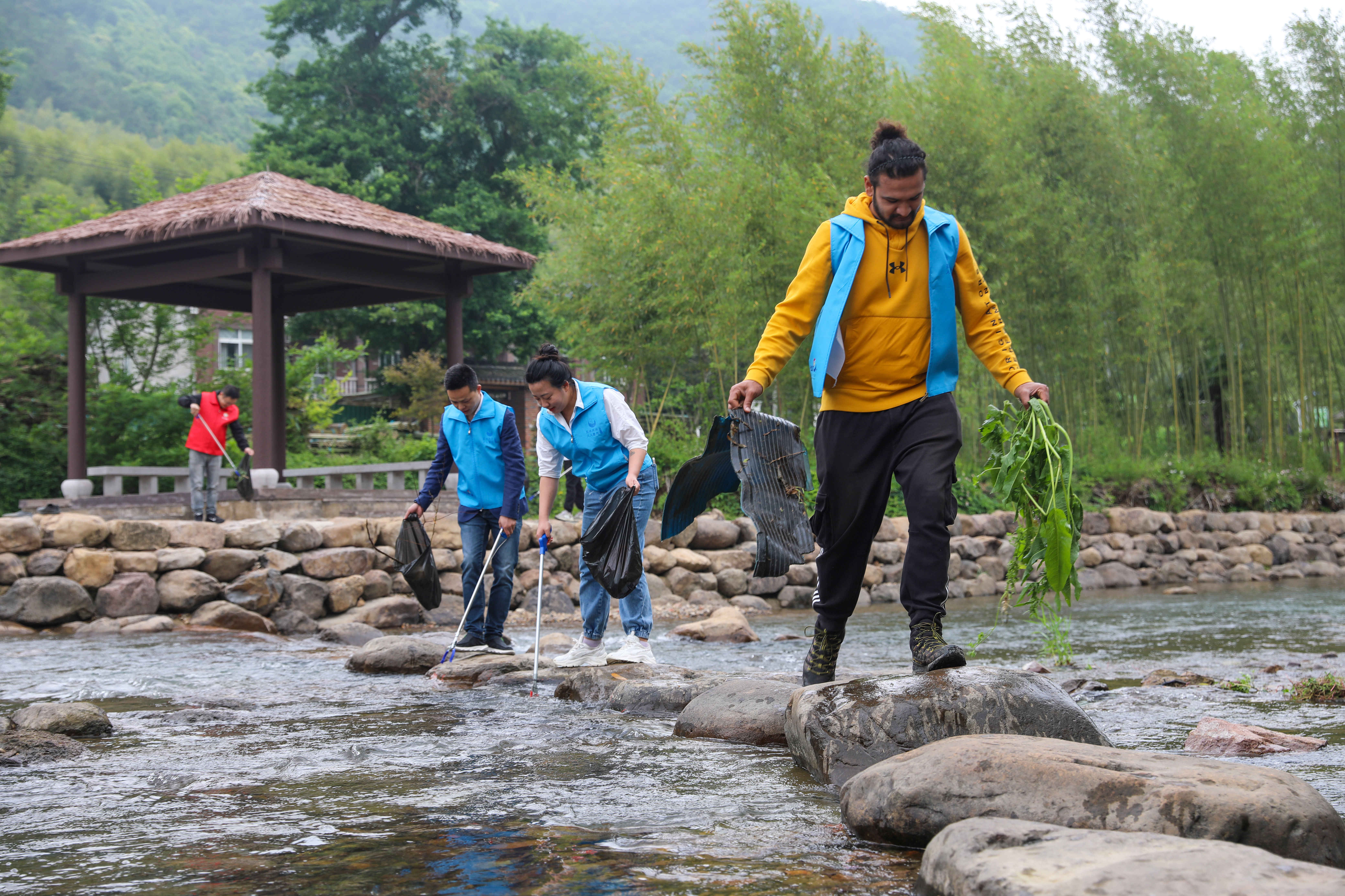 ↑2022年4月27日,在浙江省湖州市德清县莫干山镇勤劳村,来自尼泊尔的“洋河长”飞龙(右一)和志愿者一同,对水面的漂浮物、水草及沿岸垃圾进行清理。CICPHOTO/赵宁 摄