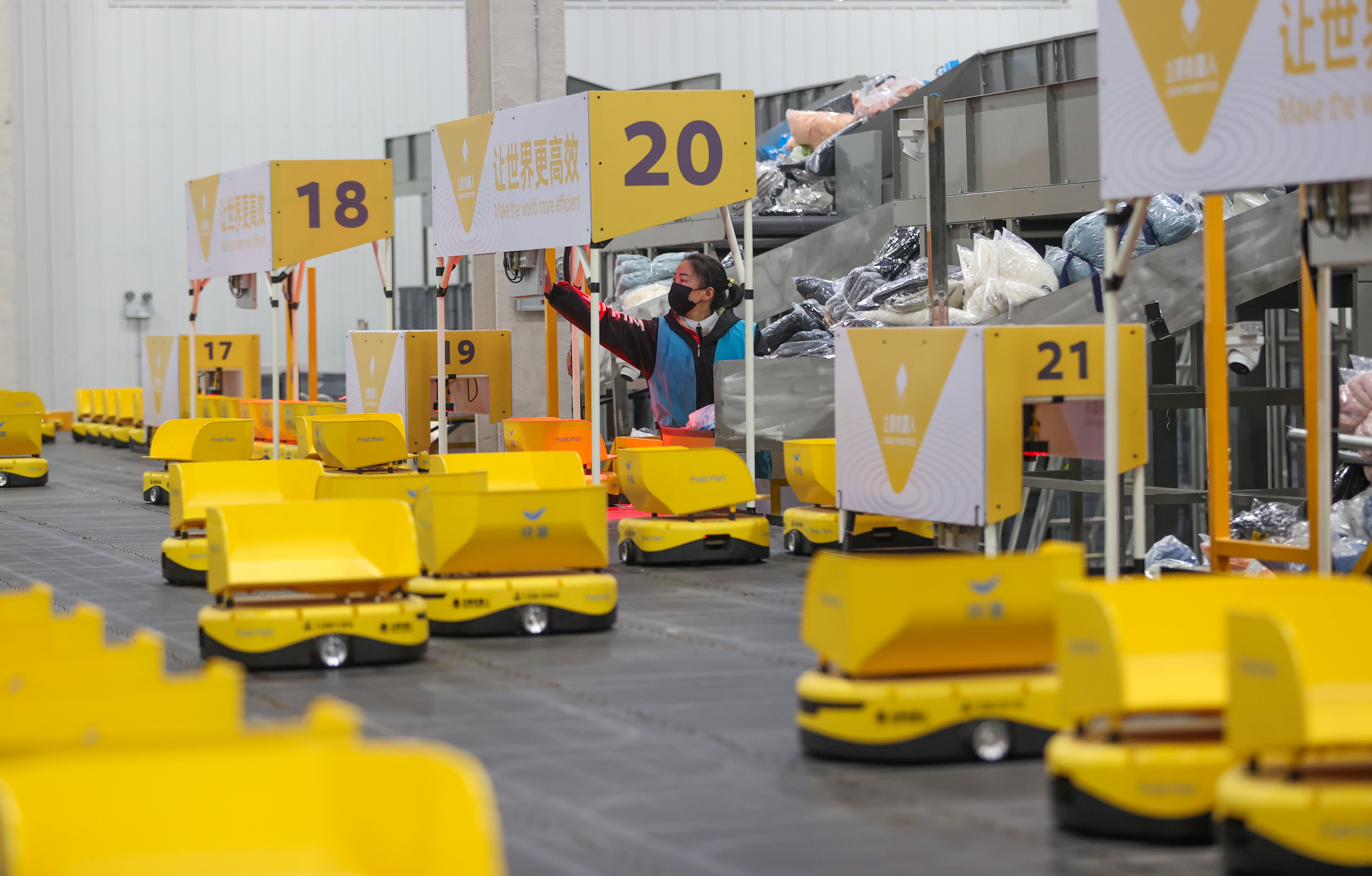 ↑2022年1月4日,在浙江省湖州市德清县乾元镇第一产业智慧物流园区的一服饰有限公司华东物流中心,工作人员在给“小黄人”机器人分配快件。CICPHOTO/王树成 摄