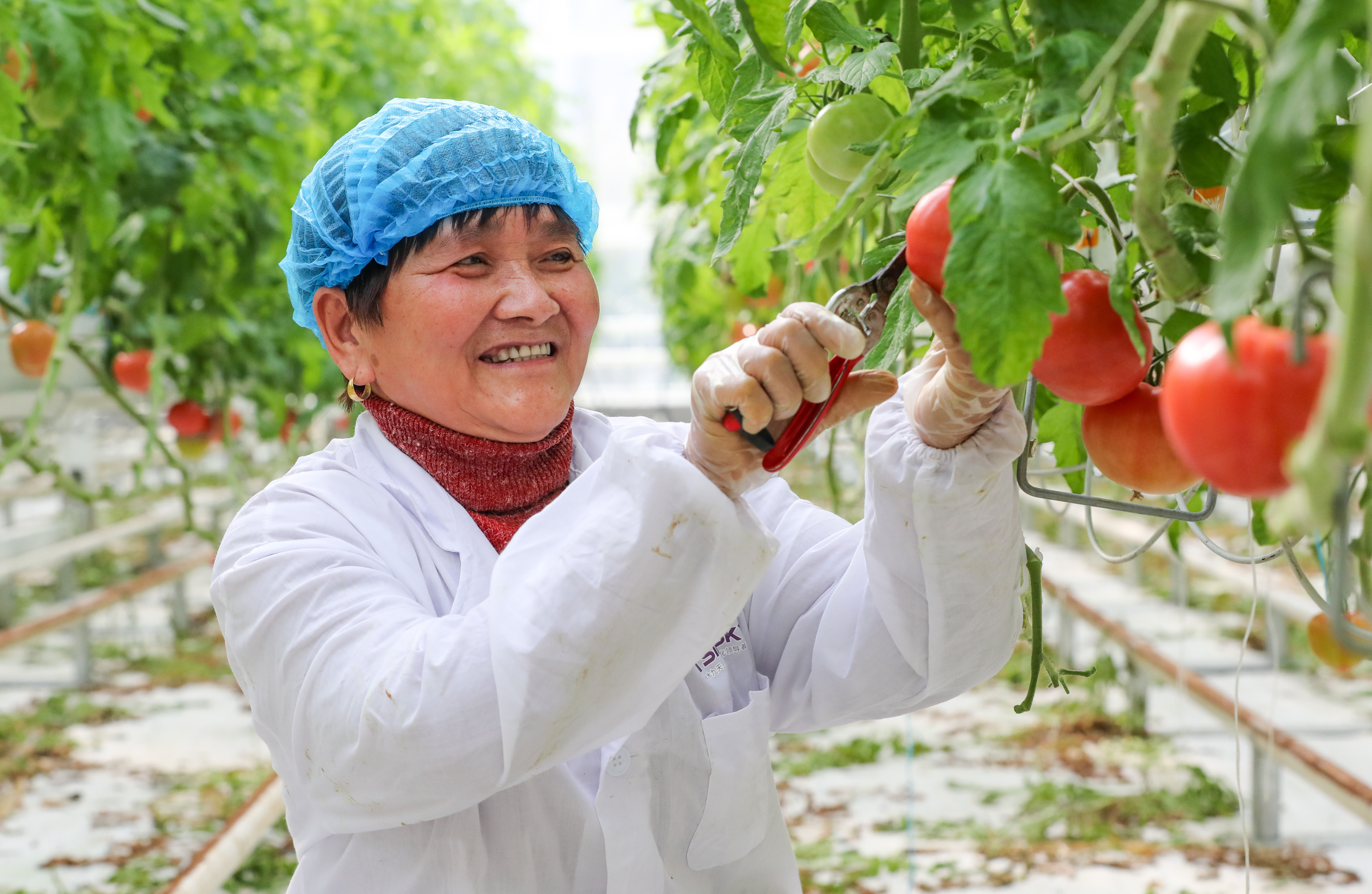 ↑2022年2月26日,在浙江省湖州市德清县阜溪街道龙胜村的水木莫干山都市农业园,工作人员在采摘无土栽培的西红柿。CICPHOTO/王树成 摄